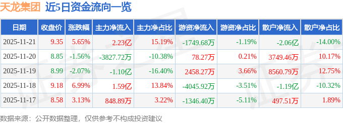 证券之星消息,截至2025年11月21日收盘,天龙集团(300063)报收于9.35元,上涨5.65%,换手率25.14%,成交量157.52万手,成交额14.68亿元。