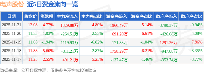 证券之星消息,截至2025年11月21日收盘,电声股份(300805)报收于12.08元,上涨4.77%,换手率10.99%,成交量31.68万手,成交额3.81亿元。