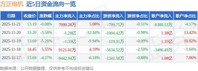 证券之星消息,截至2025年11月21日收盘,方正电机(002196)报收于13.19元,下跌0.08%,换手率21.45%,成交量104.73万手,成交额13.96亿元。
