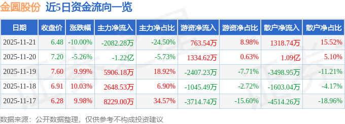 证券之星消息,截至2025年11月21日收盘,金圆股份(000546)报收于6.48元,下跌10.0%,跌停,换手率1.88%,成交量13.12万手,成交额8499.75万元。