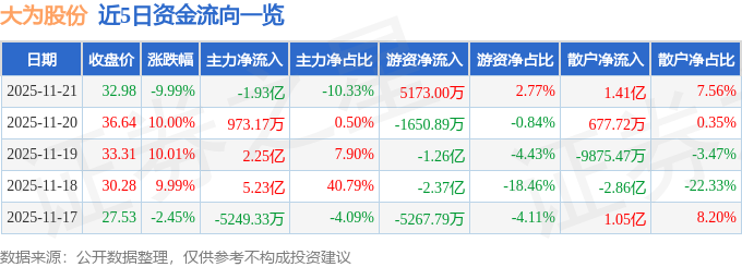 证券之星消息,截至2025年11月21日收盘,大为股份(002213)报收于32.98元,下跌9.99%,跌停,换手率26.87%,成交量55.53万手,成交额18.7亿元。