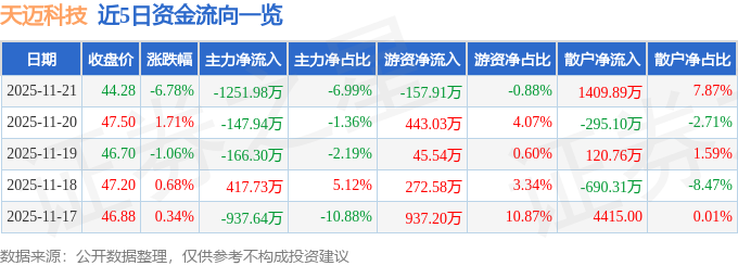 证券之星消息,截至2025年11月21日收盘,天迈科技(300807)报收于44.28元,下跌6.78%,换手率7.62%,成交量3.96万手,成交额1.79亿元。