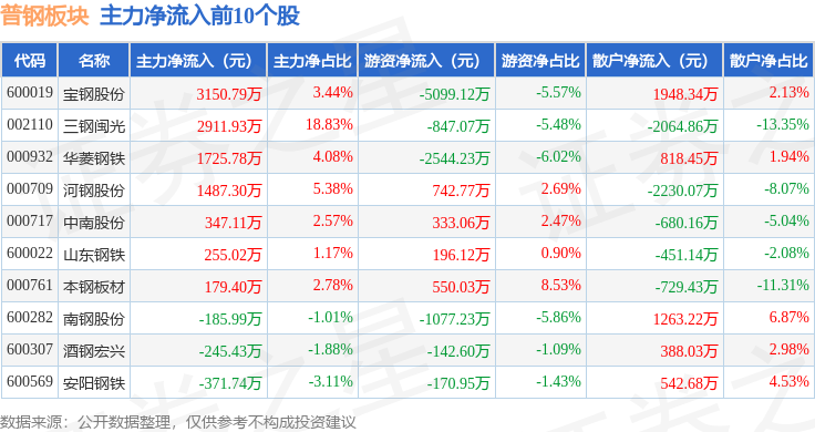 从资金流向上来看,当日普钢板块主力资金净流出4.89亿元,游资资金净流入82.84万元,散户资金净流入4.89亿元。普钢板块个股资金流向见下表: