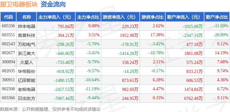 从资金流向上来看,当日厨卫电器板块主力资金净流出1.21亿元,游资资金净流入2834.22万元,散户资金净流入9218.31万元。厨卫电器板块个股资金流向见下表: