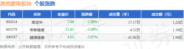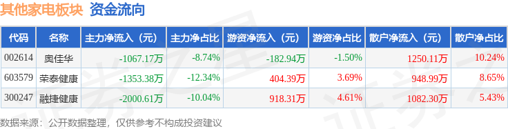 从资金流向上来看,当日其他家电板块主力资金净流出4421.15万元,游资资金净流入1139.76万元,散户资金净流入3281.39万元。其他家电板块个股资金流向见下表: