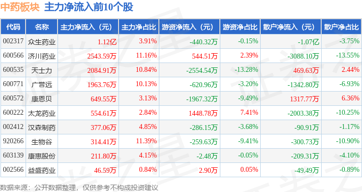 从资金流向上来看,当日中药板块主力资金净流出12.76亿元,游资资金净流入1.91亿元,散户资金净流入10.85亿元。中药板块个股资金流向见下表: