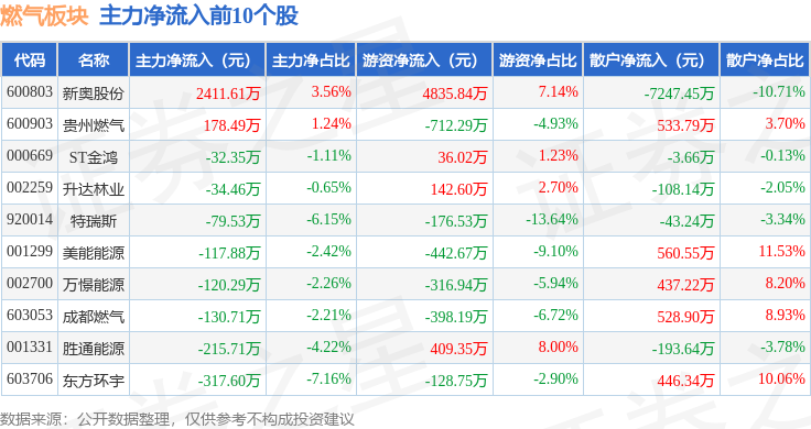 从资金流向上来看,当日燃气板块主力资金净流出6.14亿元,游资资金净流入1.69亿元,散户资金净流入4.45亿元。燃气板块个股资金流向见下表: