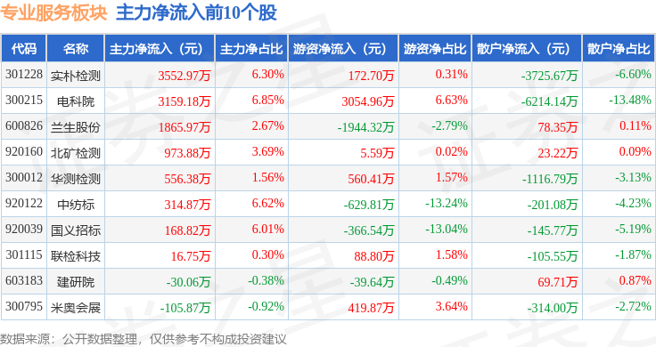 从资金流向上来看,当日专业服务板块主力资金净流出1.58亿元,游资资金净流入8724.45万元,散户资金净流入7046.82万元。专业服务板块个股资金流向见下表: