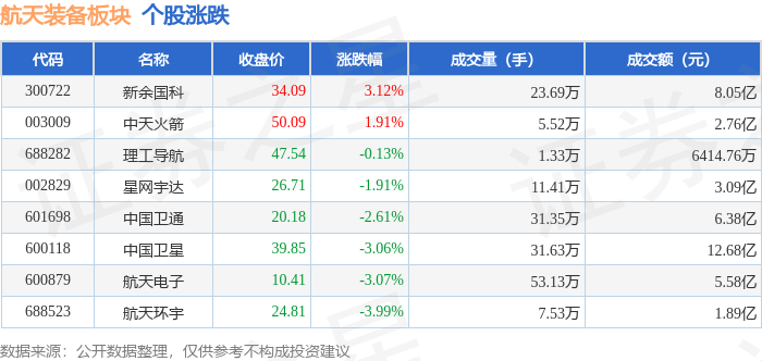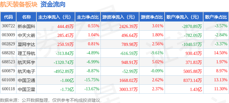 从资金流向上来看,当日航天装备板块主力资金净流出3.3亿元,游资资金净流入8663.74万元,散户资金净流入2.43亿元。航天装备板块个股资金流向见下表: