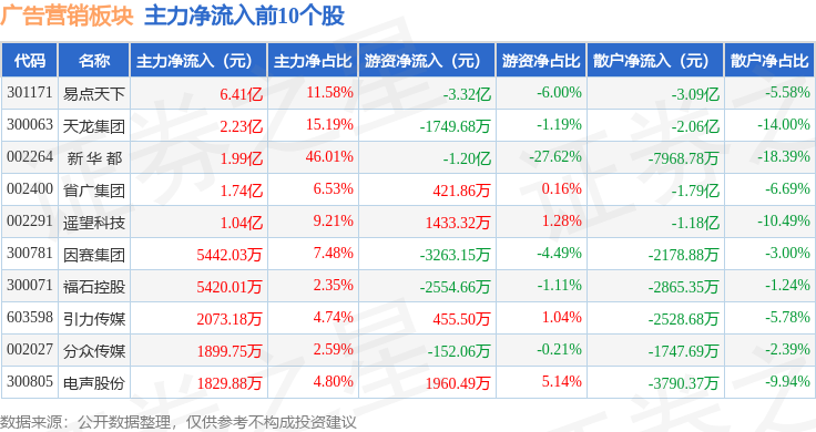 从资金流向上来看,当日广告营销板块主力资金净流入8.92亿元,游资资金净流出1.56亿元,散户资金净流出7.36亿元。广告营销板块个股资金流向见下表: