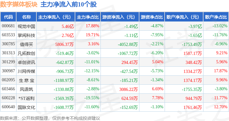 从资金流向上来看,当日数字媒体板块主力资金净流入6.9亿元,游资资金净流出1.74亿元,散户资金净流出5.16亿元。数字媒体板块个股资金流向见下表: