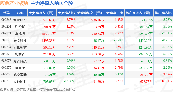从资金流向上来看,当日应急产业板块主力资金净流出14.94亿元,游资资金净流入3.07亿元,散户资金净流入11.87亿元。应急产业板块个股资金流向见下表: