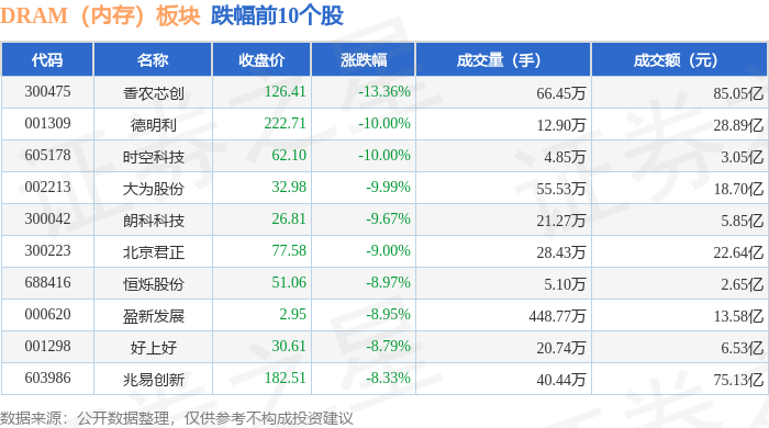 证券之星消息,11月21日DRAM(内存)板块较上一交易日下跌6.56%,香农芯创领跌。当日上证指数报收于3834.89,下跌2.45%。深证成指报收于12538.07,下跌3.41%。DRAM(内存)板块个股涨跌见下表: