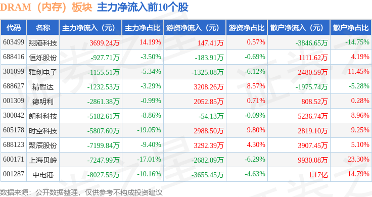 从资金流向上来看,当日DRAM(内存)板块主力资金净流出63.87亿元,游资资金净流入15.15亿元,散户资金净流入48.71亿元。DRAM(内存)板块个股资金流向见下表: