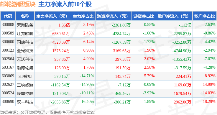 从资金流向上来看,当日邮轮游艇板块主力资金净流出4.19亿元,游资资金净流入1.36亿元,散户资金净流入2.83亿元。邮轮游艇板块个股资金流向见下表: