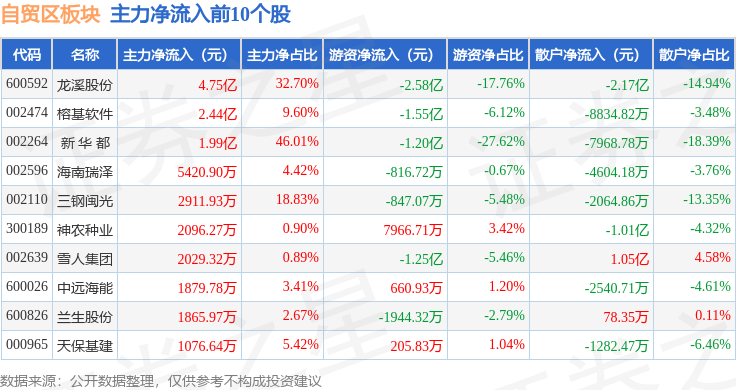 从资金流向上来看,当日自贸区板块主力资金净流出64.04亿元,游资资金净流入11.34亿元,散户资金净流入52.7亿元。自贸区板块个股资金流向见下表: