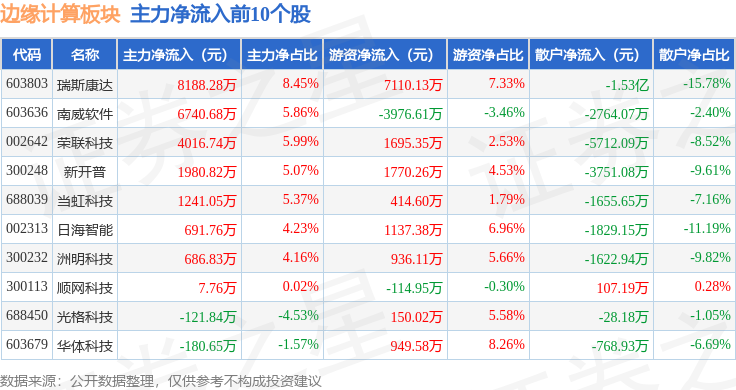 从资金流向上来看,当日边缘计算板块主力资金净流出43.18亿元,游资资金净流入10.91亿元,散户资金净流入32.27亿元。边缘计算板块个股资金流向见下表:
