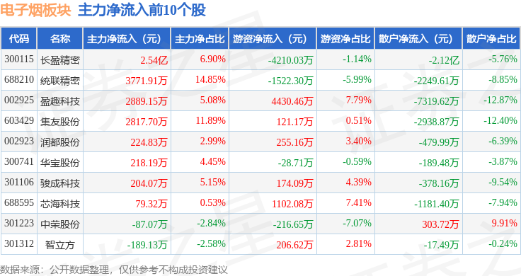 从资金流向上来看,当日电子烟板块主力资金净流出29.09亿元,游资资金净流入4.7亿元,散户资金净流入24.39亿元。电子烟板块个股资金流向见下表: