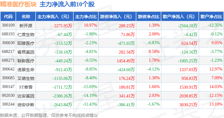 从资金流向上来看,当日精准医疗板块主力资金净流出6.79亿元,游资资金净流出2633.66万元,散户资金净流入7.05亿元。精准医疗板块个股资金流向见下表: