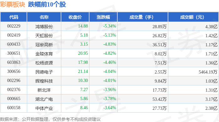 证券之星消息,11月21日彩票板块较上一交易日下跌2.57%,鸿博股份领跌。当日上证指数报收于3834.89,下跌2.45%。深证成指报收于12538.07,下跌3.41%。彩票板块个股涨跌见下表: