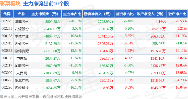 从资金流向上来看,当日彩票板块主力资金净流出3.63亿元,游资资金净流入1982.45万元,散户资金净流入3.43亿元。彩票板块个股资金流向见下表: