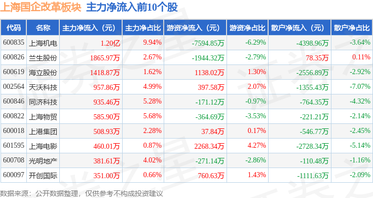 从资金流向上来看,当日上海国企改革板块主力资金净流出25.9亿元,游资资金净流入4.7亿元,散户资金净流入21.2亿元。上海国企改革板块个股资金流向见下表: