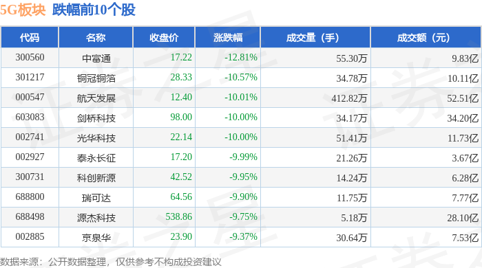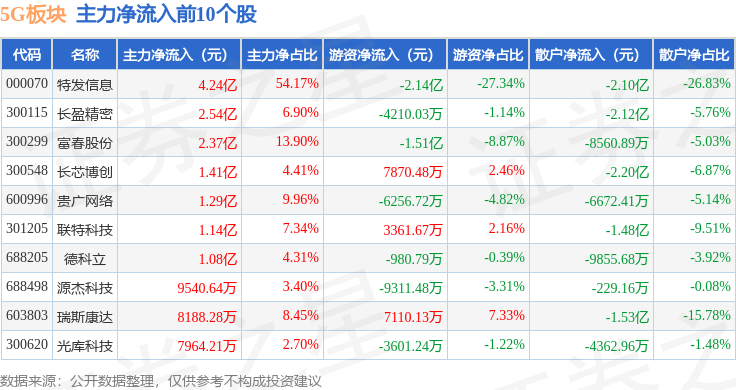 从资金流向上来看,当日5G板块主力资金净流出166.1亿元,游资资金净流入51.86亿元,散户资金净流入114.25亿元。5G板块个股资金流向见下表: