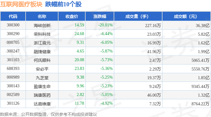 证券之星消息,11月21日互联网医疗板块较上一交易日下跌2.47%,海峡创新领跌。当日上证指数报收于3834.89,下跌2.45%。深证成指报收于12538.07,下跌3.41%。互联网医疗板块个股涨跌见下表: