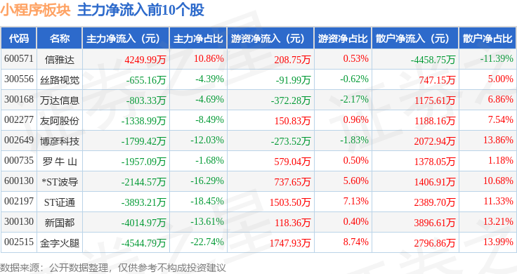 从资金流向上来看,当日小程序板块主力资金净流出5.42亿元,游资资金净流入1.01亿元,散户资金净流入4.41亿元。小程序板块个股资金流向见下表: