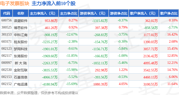 从资金流向上来看,当日电子发票板块主力资金净流出8.09亿元,游资资金净流入1.92亿元,散户资金净流入6.18亿元。电子发票板块个股资金流向见下表: