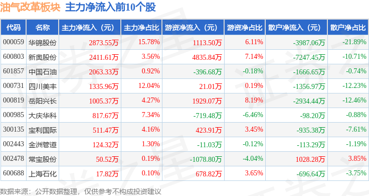 从资金流向上来看,当日油气改革板块主力资金净流出10.95亿元,游资资金净流入2.65亿元,散户资金净流入8.3亿元。油气改革板块个股资金流向见下表: