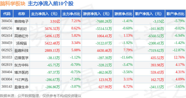 从资金流向上来看,当日脑科学板块主力资金净流出11.44亿元,游资资金净流入2.86亿元,散户资金净流入8.57亿元。脑科学板块个股资金流向见下表: