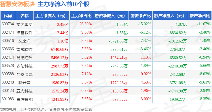 从资金流向上来看,当日智慧安防板块主力资金净流出32.5亿元,游资资金净流入1.95亿元,散户资金净流入30.55亿元。智慧安防板块个股资金流向见下表: