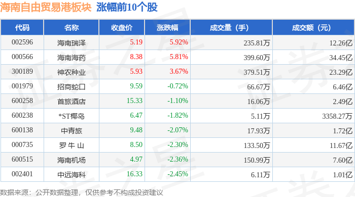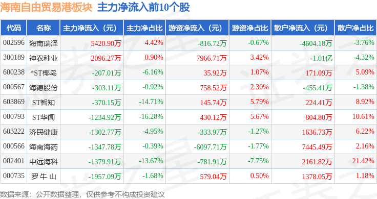 从资金流向上来看,当日海南自由贸易港板块主力资金净流出13.94亿元,游资资金净流入3.79亿元,散户资金净流入10.16亿元。海南自由贸易港板块个股资金流向见下表: