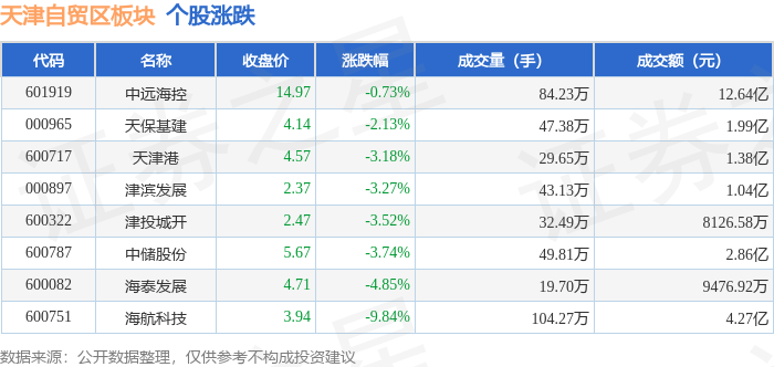从资金流向上来看,当日天津自贸区板块主力资金净流出1.64亿元,游资资金净流入1.35亿元,散户资金净流入2885.89万元。天津自贸区板块个股资金流向见下表: