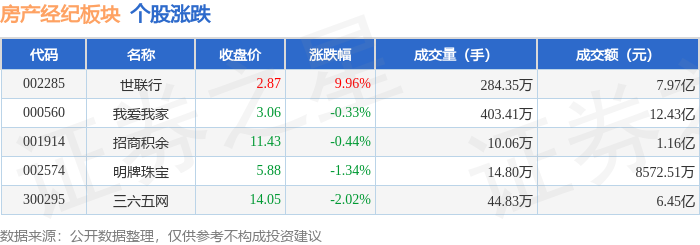 证券之星消息,11月21日房产经纪板块较上一交易日上涨1.17%,世联行领涨。当日上证指数报收于3834.89,下跌2.45%。深证成指报收于12538.07,下跌3.41%。房产经纪板块个股涨跌见下表: