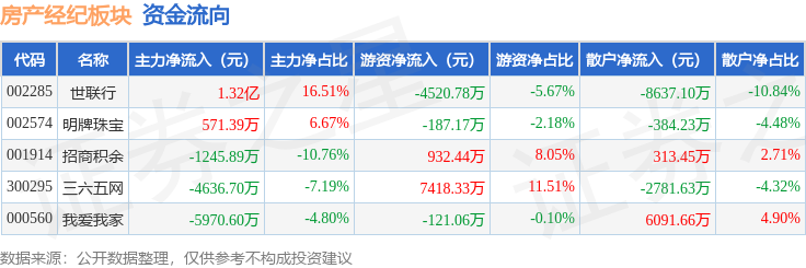 从资金流向上来看,当日房产经纪板块主力资金净流入1876.09万元,游资资金净流入3521.76万元,散户资金净流出5397.85万元。房产经纪板块个股资金流向见下表: