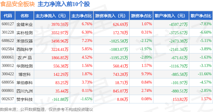 从资金流向上来看,当日食品安全板块主力资金净流出4.63亿元,游资资金净流入9087.53万元,散户资金净流入3.73亿元。食品安全板块个股资金流向见下表: