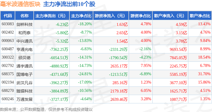 从资金流向上来看,当日毫米波通信板块主力资金净流出23.26亿元,游资资金净流入6.49亿元,散户资金净流入16.76亿元。毫米波通信板块个股资金流向见下表: