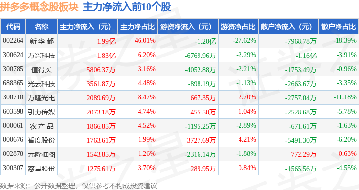 从资金流向上来看,当日拼多多概念股板块主力资金净流出1.26亿元,游资资金净流出1.54亿元,散户资金净流入2.8亿元。拼多多概念股板块个股资金流向见下表: