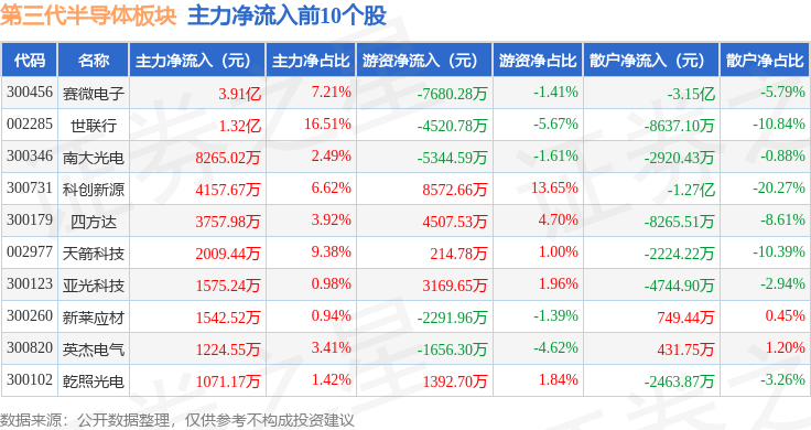 从资金流向上来看,当日第三代半导体板块主力资金净流出78.51亿元,游资资金净流入15.59亿元,散户资金净流入62.92亿元。第三代半导体板块个股资金流向见下表: