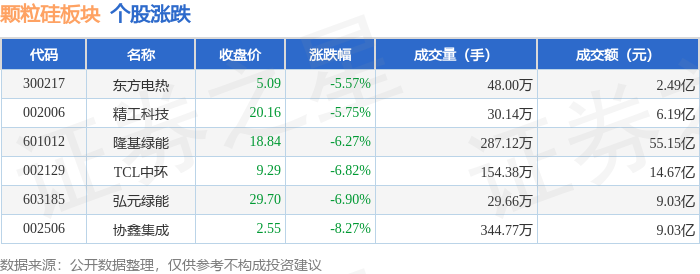 证券之星消息,11月21日颗粒硅板块较上一交易日下跌6.5%,协鑫集成领跌。当日上证指数报收于3834.89,下跌2.45%。深证成指报收于12538.07,下跌3.41%。颗粒硅板块个股涨跌见下表: