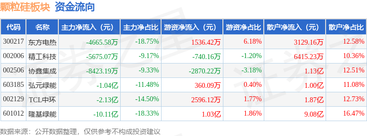 从资金流向上来看,当日颗粒硅板块主力资金净流出15.15亿元,游资资金净流入1.11亿元,散户资金净流入14.04亿元。颗粒硅板块个股资金流向见下表:
