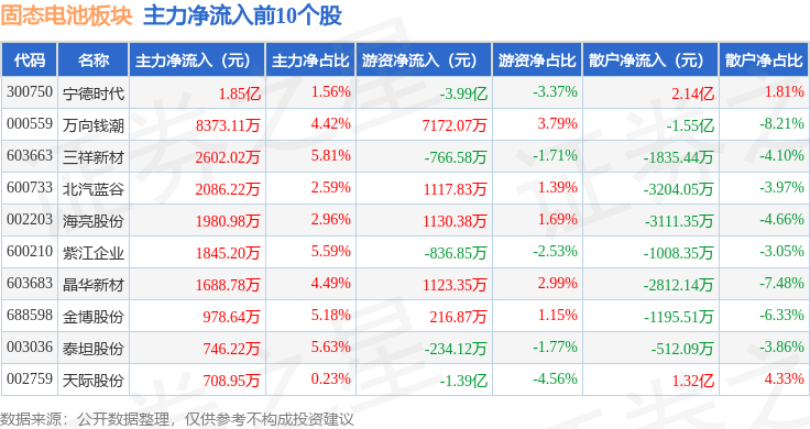 从资金流向上来看,当日固态电池板块主力资金净流出151.4亿元,游资资金净流入9.19亿元,散户资金净流入142.21亿元。固态电池板块个股资金流向见下表: