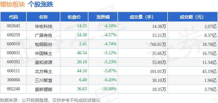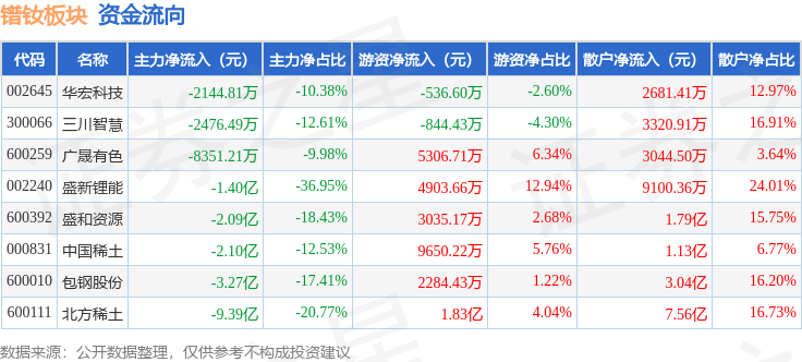 从资金流向上来看,当日镨钕板块主力资金净流出19.55亿元,游资资金净流入4.21亿元,散户资金净流入15.34亿元。镨钕板块个股资金流向见下表: