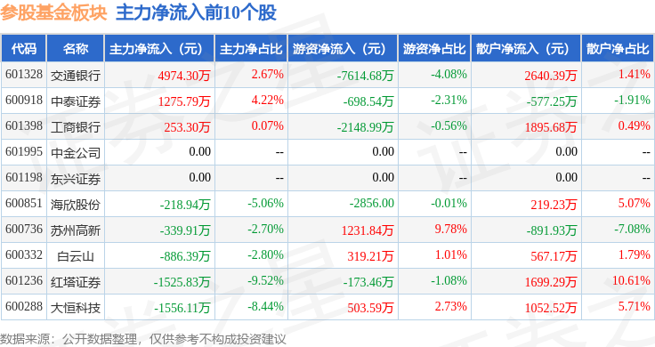 从资金流向上来看,当日参股基金板块主力资金净流出58.67亿元,游资资金净流入20.07亿元,散户资金净流入38.6亿元。参股基金板块个股资金流向见下表: