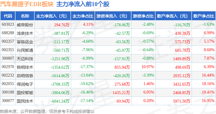 从资金流向上来看,当日汽车黑匣子EDR板块主力资金净流出12.5亿元,游资资金净流入3.16亿元,散户资金净流入9.33亿元。汽车黑匣子EDR板块个股资金流向见下表:
