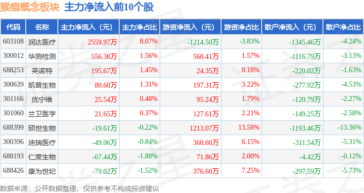 从资金流向上来看,当日猴痘概念板块主力资金净流出6.67亿元,游资资金净流入1.68亿元,散户资金净流入4.99亿元。猴痘概念板块个股资金流向见下表: