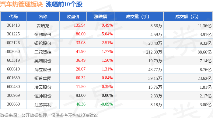证券之星消息,11月21日汽车热管理板块较上一交易日下跌2.12%,思泉新材领跌。当日上证指数报收于3834.89,下跌2.45%。深证成指报收于12538.07,下跌3.41%。汽车热管理板块个股涨跌见下表: