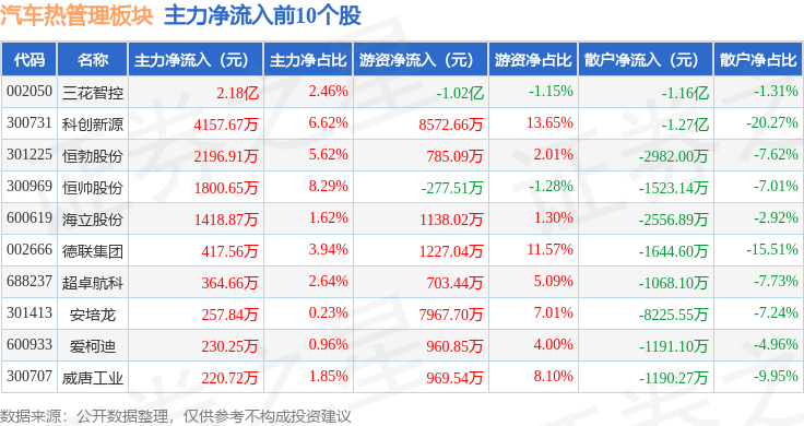 从资金流向上来看,当日汽车热管理板块主力资金净流出27.14亿元,游资资金净流入9.99亿元,散户资金净流入17.14亿元。汽车热管理板块个股资金流向见下表: